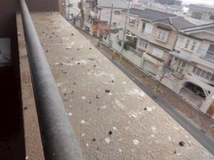 神戸市のマンションにお住まいのお客様より、「あまり使用していないベランダが鳩の糞で汚れてしまっている」とのご相談をいただきました。現地確認を行ったところ、鳩の糞が広範囲に堆積しており、さらにゴミなども放置されている状態でした。