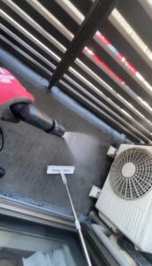 その後、ベランダに堆積した糞や汚れを丁寧に清掃し、こびりついた汚れについては高圧洗浄も併用して除去しました。